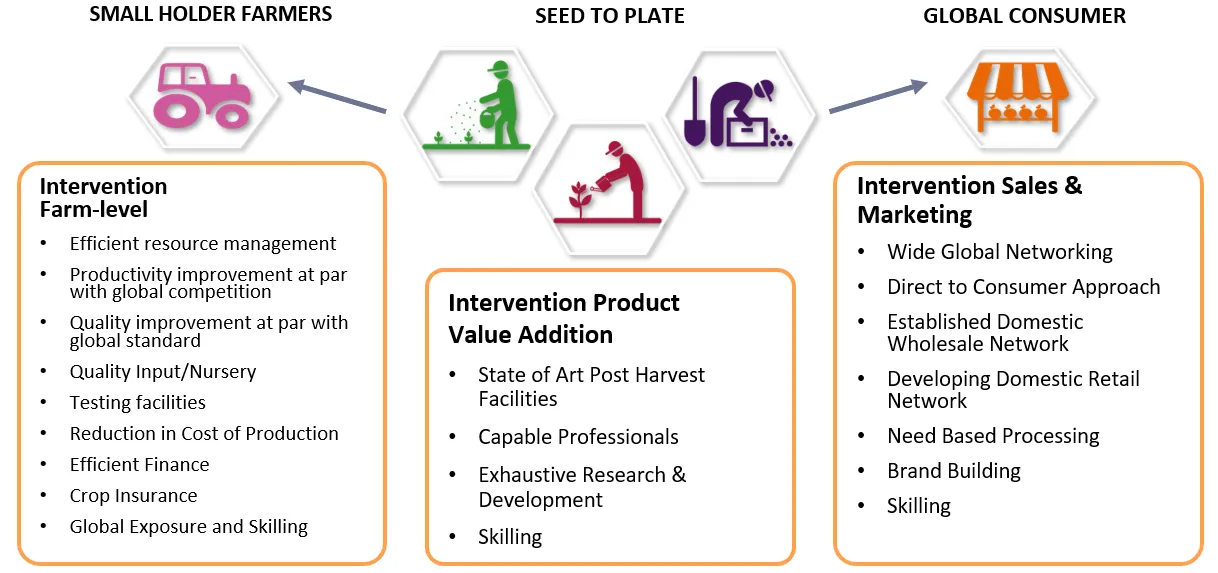 We design and build crop value chains holistically to maximise value to our farmers. Assured purchase of harvest with pre-decided parameters assures income to the farmers. They also benefit from in-season agronomy and the package of practices designed to reduce their production costs.
